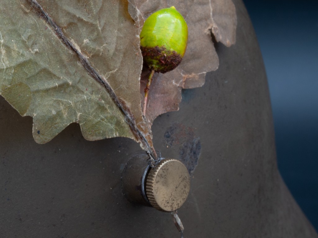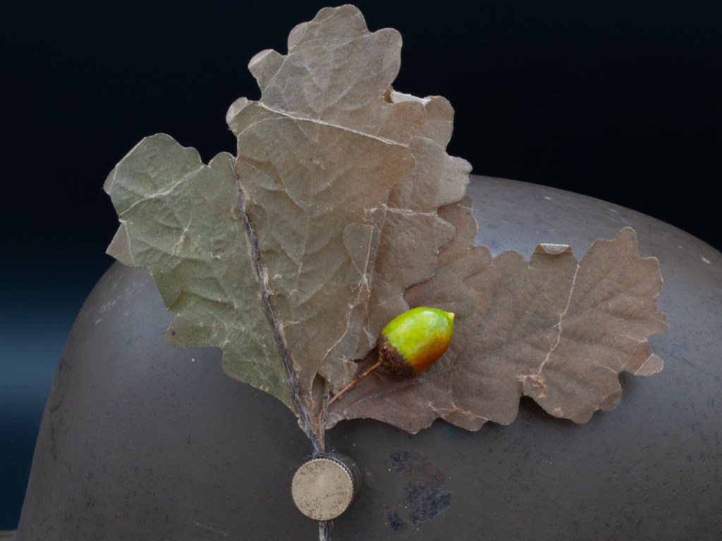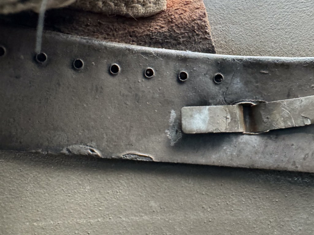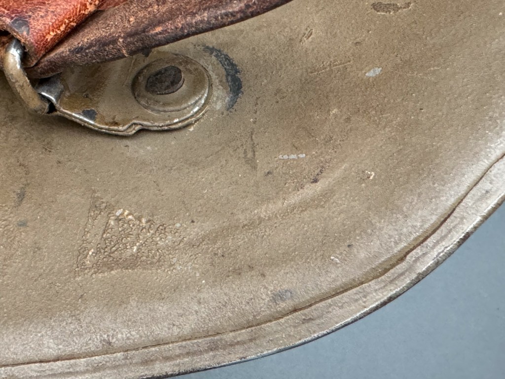 Displayed Example: This was one of the helmets that was on my original wish list for my “Stahlhelm Postwar” collection. I was lucky to find this wonderful example that a collector friend was selling at the 2024 Max Show. It is complete but for the pillows for the two liner pads in the back section of the helmet. The original owners often removed the pillows on this type of liner to adjust for a larger size head. There are no markings of any kind on this piece except for the number “66” stamped into the liner band to indicate the size. An exceptional feature of this specimen is the intact feldzeichen made of wire and waxed paper and secured by a rare and original brass screw to attach the ornament to the left side lug. This particular feldzeichen has an artificial acorn included as part of the ornament.