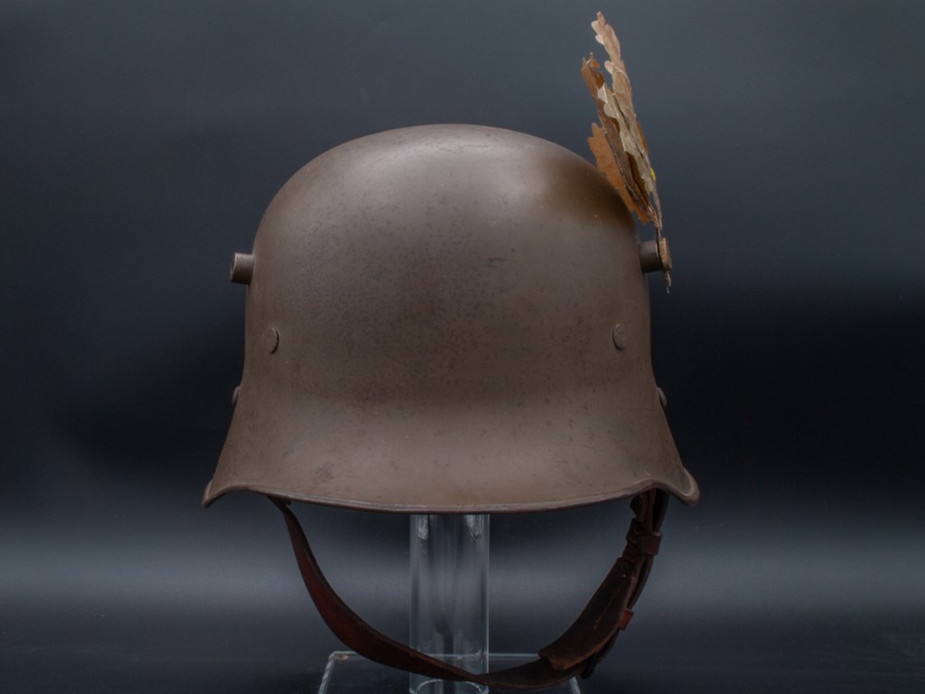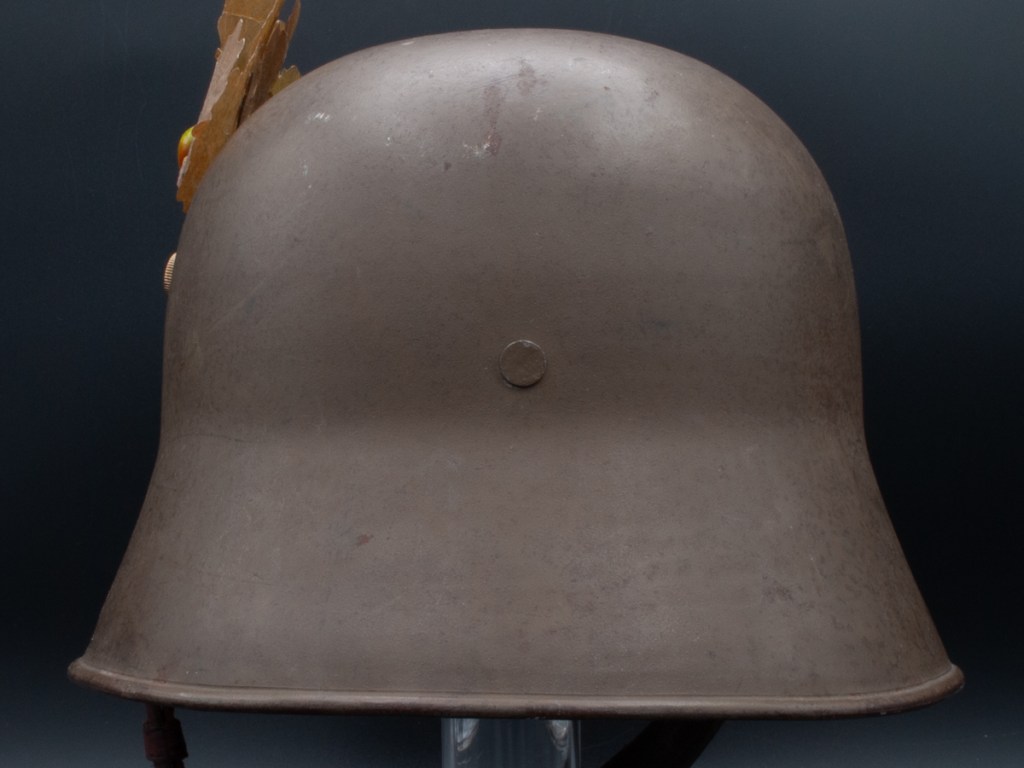 Collector Notes: After the Anschluss, the armed forces of Greater Germany refurbished and reissued the majority of the Austrian produced Model 1917 type helmets. Austrian post-WWI helmets in their original configurations are relatively difficult items to find. Despite their relative scarcity, there is not much price differential between Austro-Hungarian helmets of the First World War and Austrian helmets produced postwar. The one displayed here is the only one I have ever seen with an original feldzeichen outside of period photographs and some reference sources.
