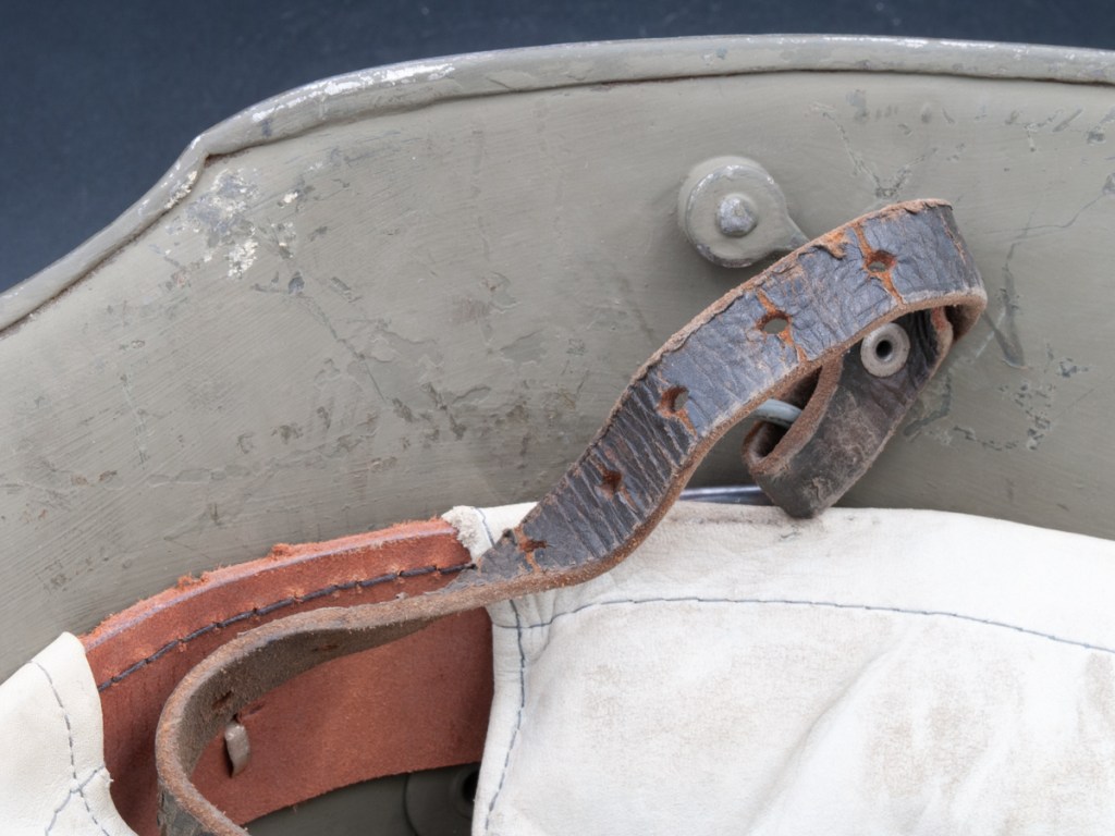After the Second World War, the Finnish army refurbished its stocks of German style helmets. Starting in the late 1940s and continuing until the late 1950s, the post-WWII refurbished German type helmets had three two-tongued leather liner pads attached to a leather liner band similar to the liners on German First World War helmets. From the late 1950s until the 1980s refurbished helmets were equipped with West German style liners.[7] These are like their WWII counterparts but have a set of perforations in a rectangular pattern in the forehead section. The WWI type helmets were occasionally refitted with this later style liner. The chinstraps are also leather. There are variations in the type of leather used for the liners (brown or white) and chinstraps (greenish/grey or black) and they vary somewhat in pattern. The liner bands were affixed using the original holes for the split rivets and the Finnish replacement split rivets are usually backed by washers. Two extra holes were drilled just behind the front rivets and rivets with smaller heads, not backed by washers, were used to help secure the liner bands to the helmet shell. The helmets were painted with a matte finish greenish/grey color or plain grey. The variations in paint color, liner configurations, etc. are because these modifications were done in different warehouses and depots in different time periods. The washer-backed split pins, the two extra split pins and the distinctive matte finish greenish/grey colors are quick differentiators to use to identify Finnish German-style helmets.