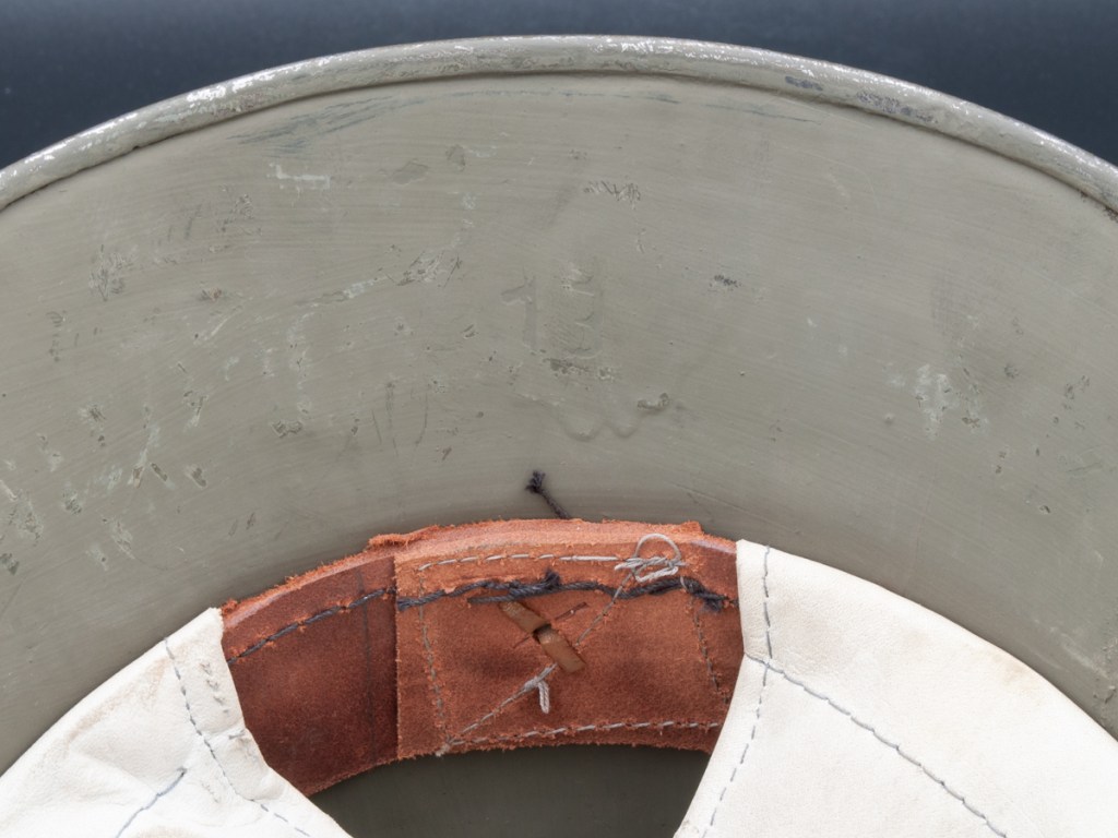 Displayed Example: By the time I decided that I wanted one of these helmets, IMA was sold out. IMA, however, had sold some of the helmets to other dealers and a Finnish military surplus dealer, Varusteleka, ended up with some of this cache. I purchased the one displayed here in 2023 for $260 + shipping cost. The helmet is a German WWI M16 or M17. It is a size 64 judging by the type of side lugs. The manufacturer stamps, size stamps and steel plate lot numbers are not visible. The only markings on the helmet are a number 13 scratched into the paint in the skirt section. The helmet appears to have been lightly used or unissued after being refurbished.