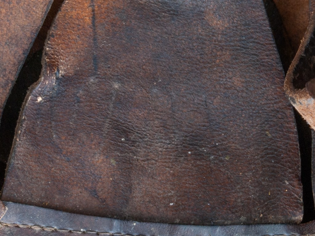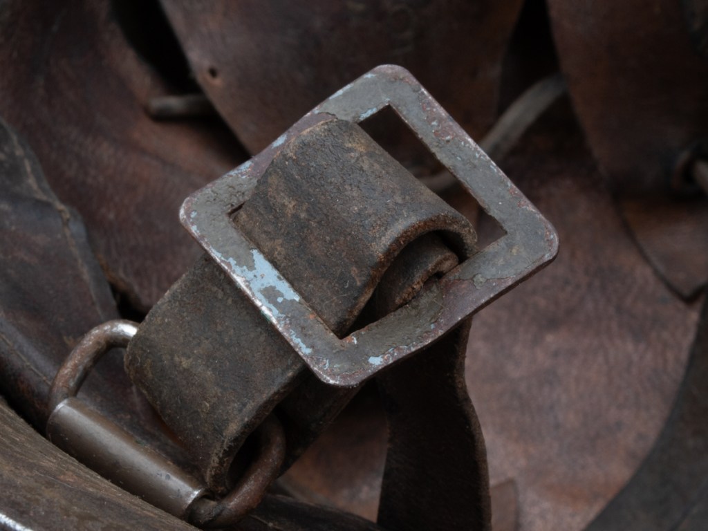 The helmet is a rare example of a M36B in its original World War Two condition. It has the type of liner originally used in the M36As. The liner consists of seven triangular leather sections with pointed ends and steel reinforced eyelets for the rawhide drawstring. These are stitched to a leather strip which is attached to a metal band. The band has five holes to accommodate split pins. Since the liner is attached with just three rivets, two holes are extraneous. It seems that the band was originally designed to attach to a helmet like the M36A or four-rivet M36B, and the rear hole may have been a modification to make it work with a three-rivet M36B. This suggests that the original configuration of the M36Bs was with four rivets and this was changed later changed to three rivets perhaps as an economic measure. The liner bands that had been produced up to that point would have been modified by drilling a hole in the back for the three-rivet version. There is a leather pad attached to the interior dome. It is stamped size 57 and the original owner’s name or initials are still partly visible on one of the triangular sections.
