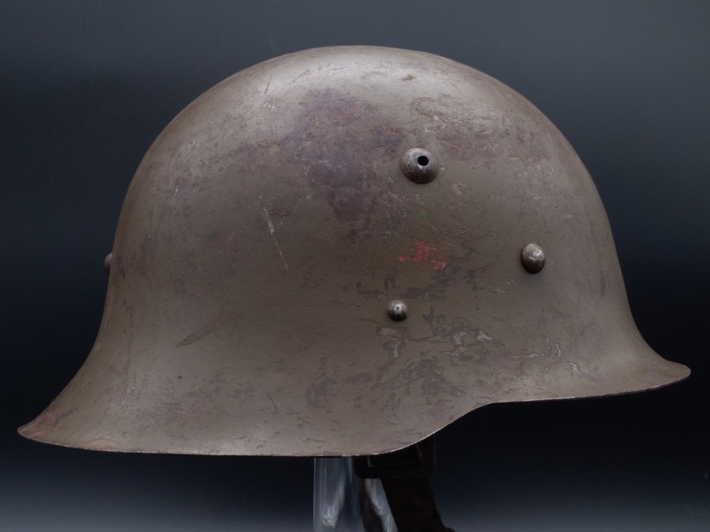 The helmet was repainted using a dark green color of paint found on some wartime helmets, but not on postwar refurbished helmets. The original tricolor decal is faintly visible under the paint on the right side.