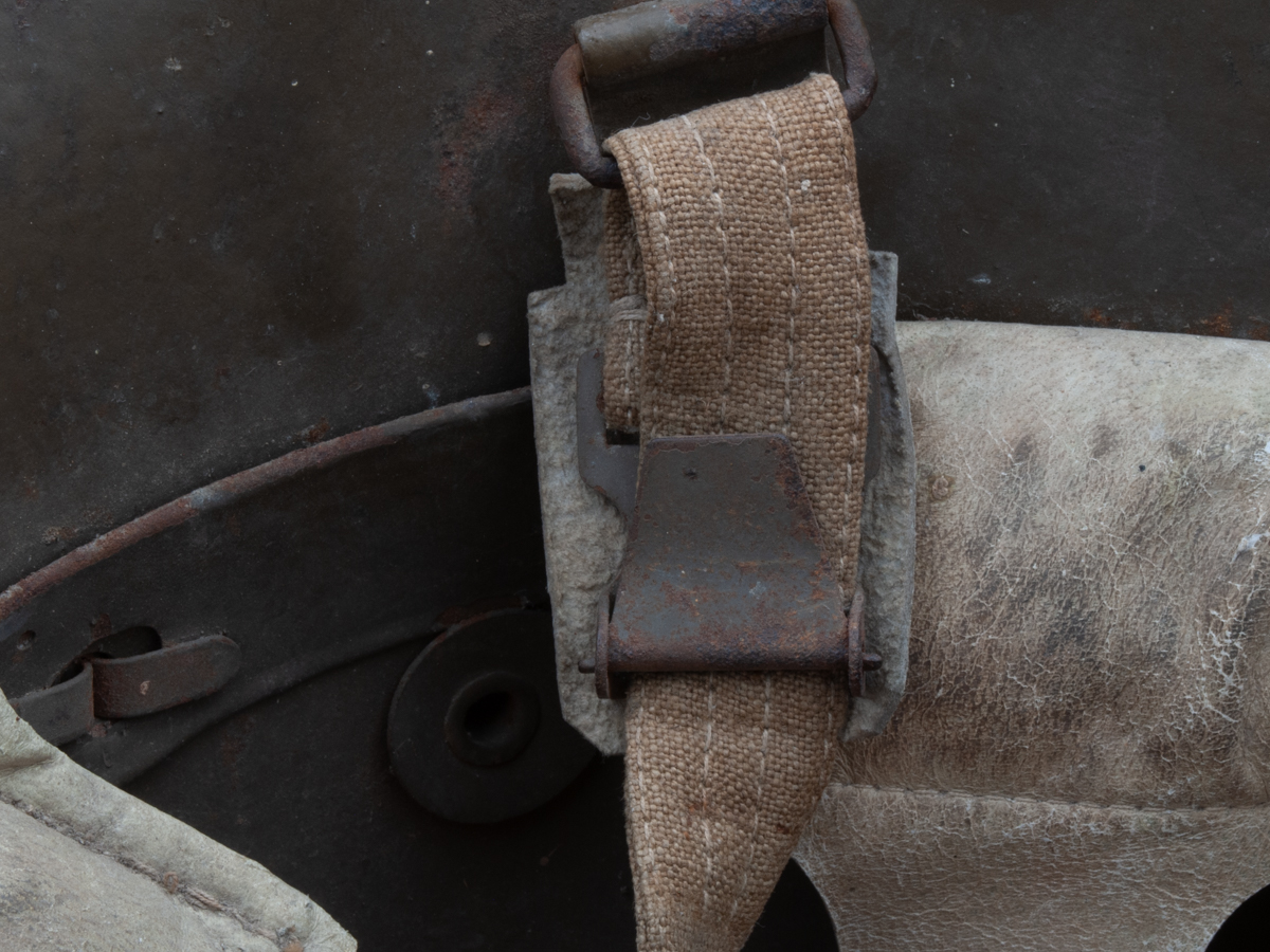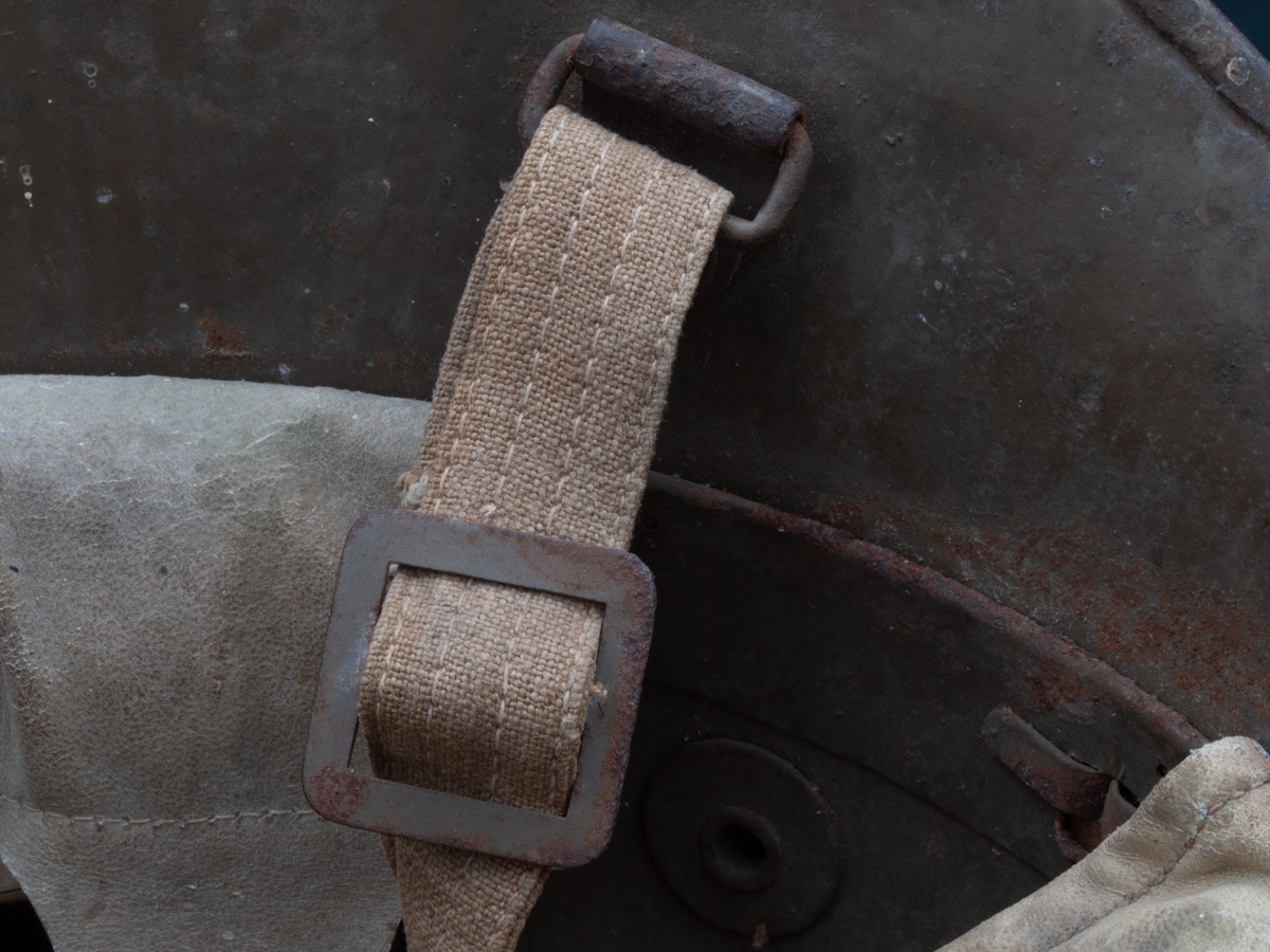 Like its predecessor, the vz.20 had chinstrap attachment rivets located in a higher position than they were in the German M16/17s. Early production runs of the helmet used the same color brown paint used on the Austro-Hungarian helmets. One external differentiator is that the split pins for the liner attachment were generally domed like those used for the attachment of the chinstrap hardware. There are many instances, however, where flat split pins were used for the liner attachment (see period photo above). In later production runs and for most of the vz.20s produced, the Czechoslovakians used a brownish-green or more solidly dark green color paint. The liners were the German WWI pattern with three leather pads attached to a metal band. The leather was most frequently white, but brown leather was also used. Early versions of the vz.20 had cloth chinstraps and chinstrap hardware that was almost identical to that used on the wartime Berndorfer helmets (see Austro-Hungarian Berndorfer). This incorporated a slide buckle and a clamp buckle. Later versions of the vz.20 used a leather chinstrap with a split section in the middle for placement of the wearer’s chin. The same chinstrap was used on the vz.32 (see Czechoslovakian vz.32).