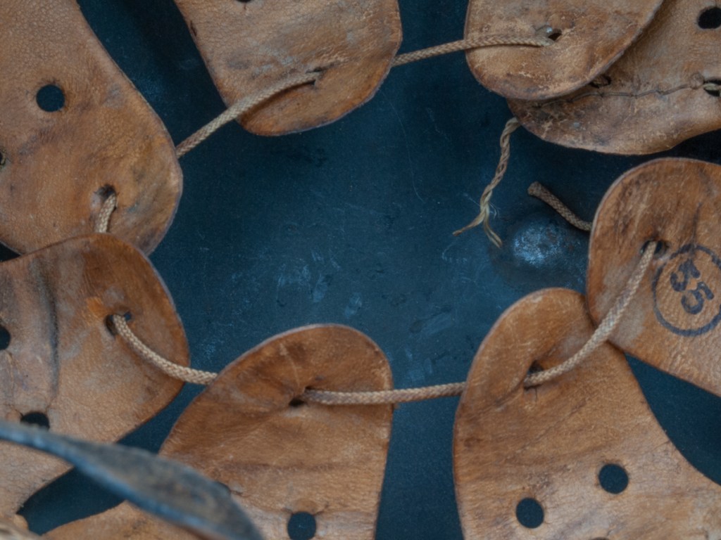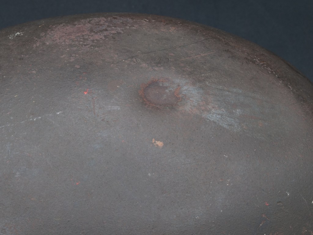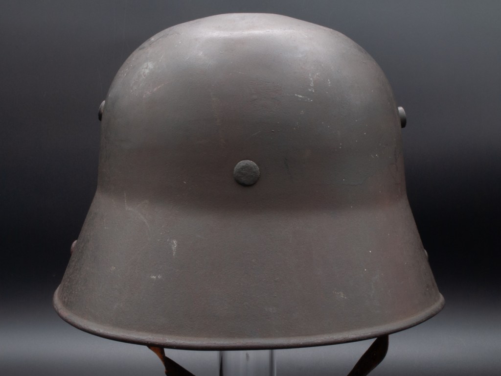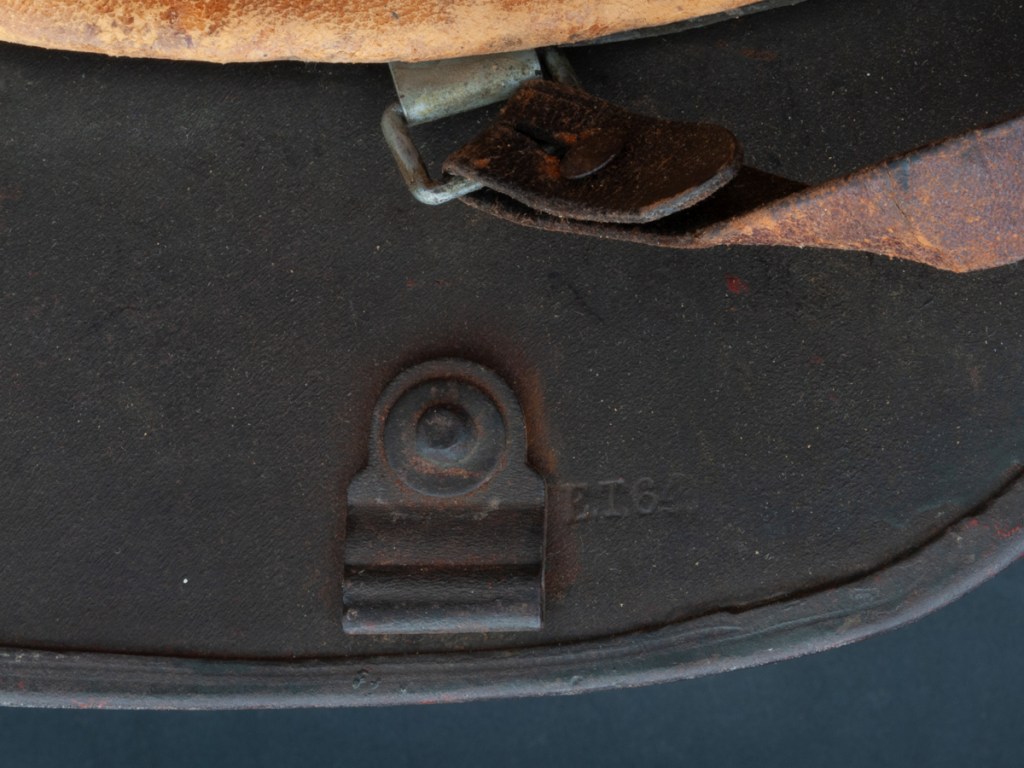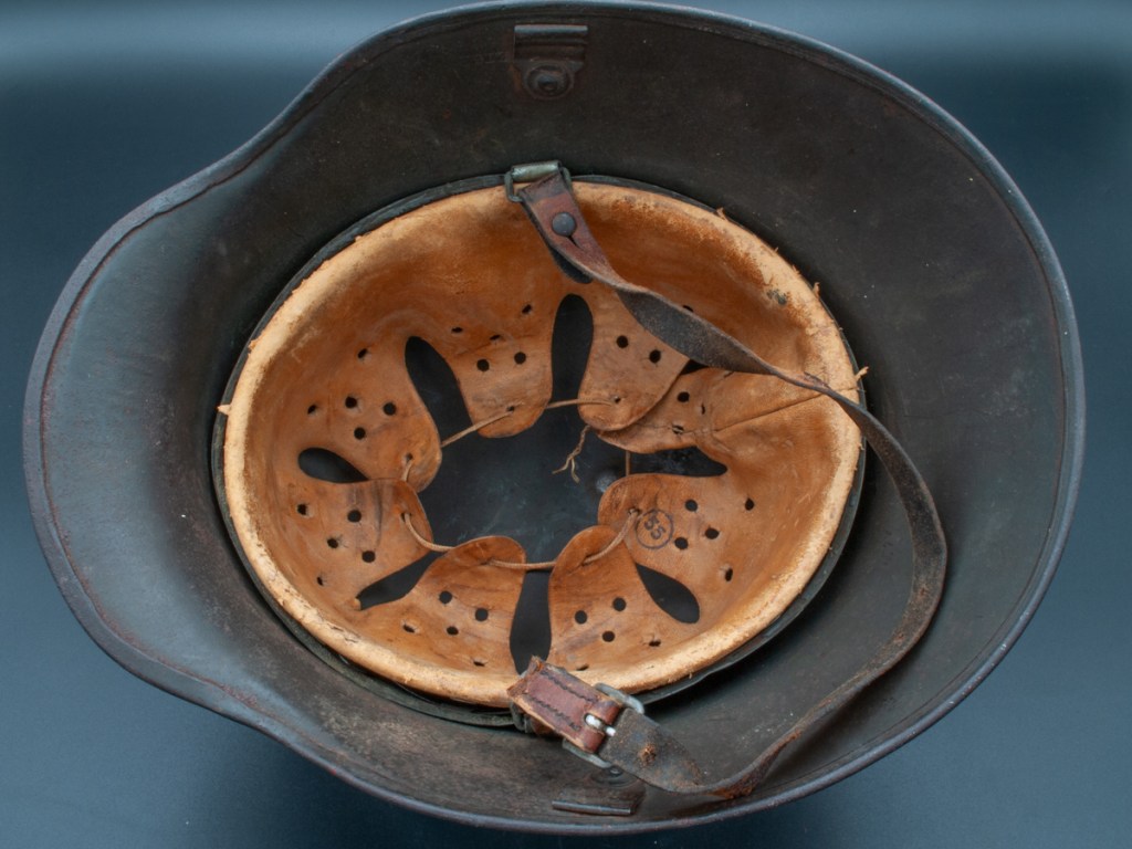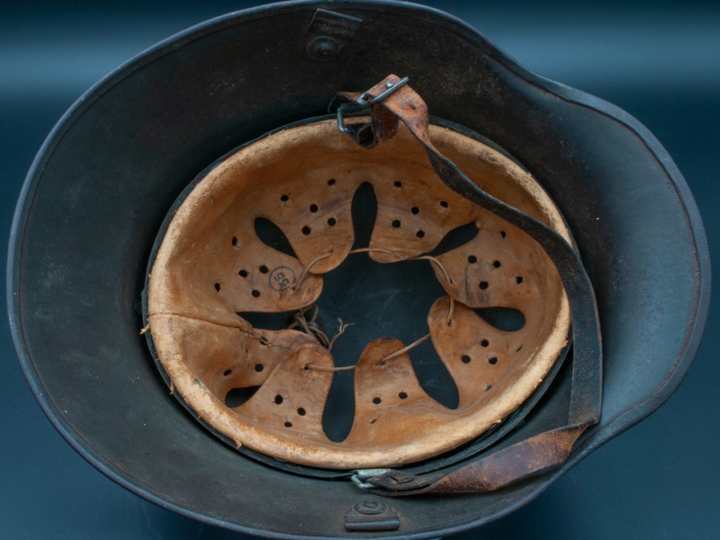 The helmet is entirely original as far as I can detect and it is complete, down to the original drawstring, which is often missing on these helmets. The liner is a size 62. This, therefore, is a size 64 M16/17 helmet shell equipped with a liner for a size 62 M40/42 helmet. This kind of mismatch in transitional and reissued WWI helmet is not unusual. There is a 1cm round dent on the top of the helmet. This may have been caused by a bullet or shrapnel strike.