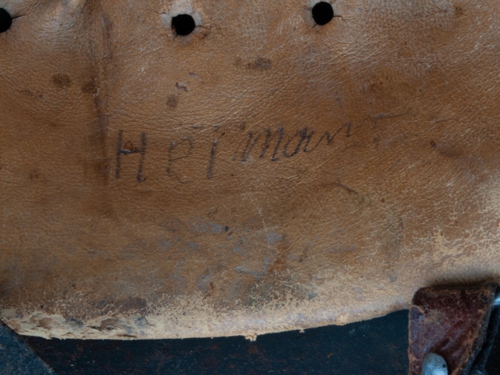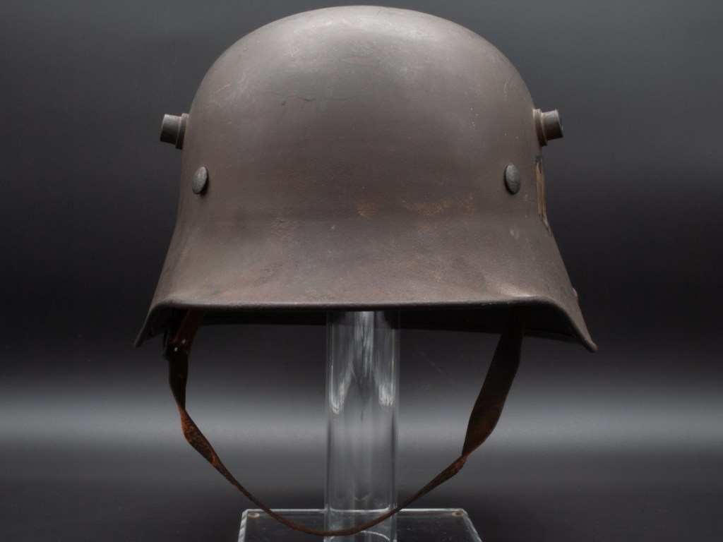 Displayed Example: I purchased this helmet from Ken Niewiarowicz of German Helmets Inc. This helmet had a usual journey. It was manufactured during World War One by the Eisenhüttenwerk factory in town of Thale in Central Germany. It is a size 64, which is the most common. The helmet was among the consignments of helmets that the Germans provided to their Austro-Hungarian allies during the war. The Austro-Hungarians installed their own style of chinstrap hardware using the holes that were originally drilled for German M91 type chinstrap assemblies. After the Anschluss with Austria and after the German takeover of Czechoslovakia, old stocks of First World War helmets that had been part of the Austro-Hungarian arsenals, including this helmet, became available to German armed forces. Some time between 1940 and the end of 1943 when decals were no longer applied to Wehrmacht helmets, this helmet was refurbished. The original liner and chinstrap were replaced, but the Austro-Hungarian chinstrap hardware was not removed. The helmet was then issued to a Wehrmacht soldier named “Herman” and he etched his name in the liner.