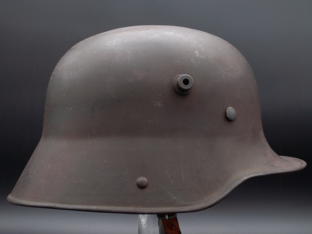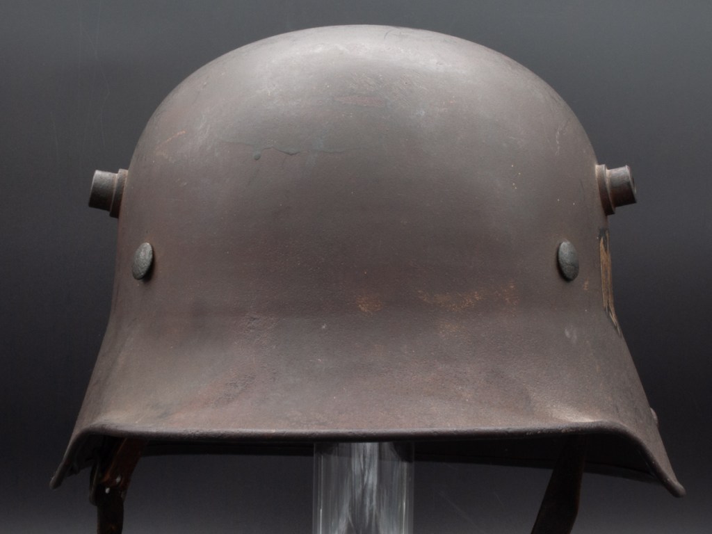 General Information: During the Second World War the Germans reissued helmets from the First World War. These were German made M16/17/18 type helmets as well as Austro-Hungarian, postwar manufactured Austrian helmets, and postwar manufactured Czechoslovakian German model helmets. The helmets were sent to factories where they were refurbished according to the 1940 specifications for helmets. This involved stripping the old paint, repainting with rough textured feldqrau paint and equipping them with M31 type liners and chinstraps. These helmets either had one decal, typically Wehrmacht, or had no decals.