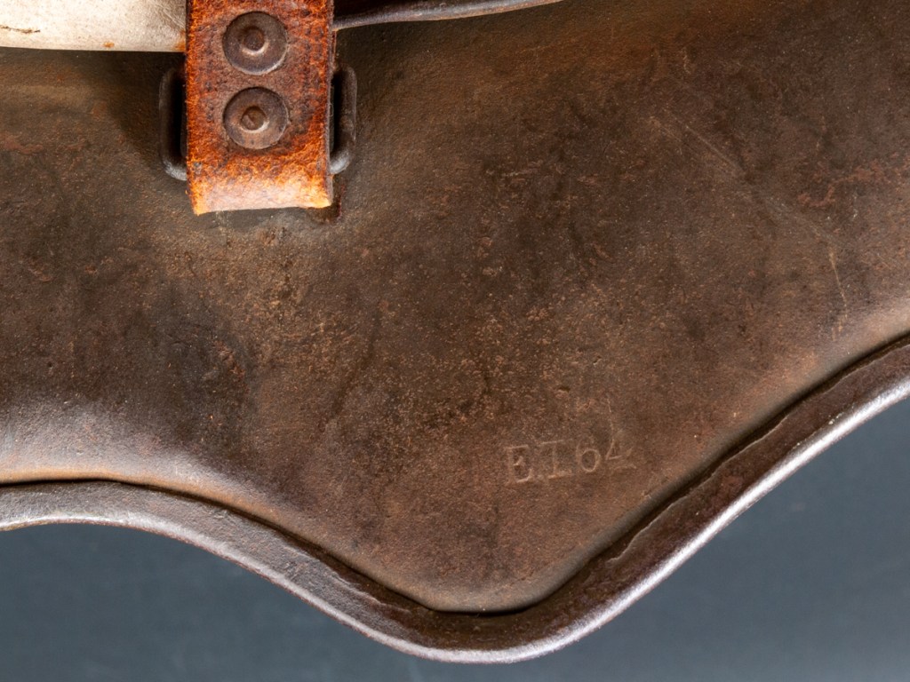 On German helmets of the First World War, the prefix on the lot number is an abbreviation for the steel mill that produced the plates for the helmets. For instance, “R” represented the company Röchling. A collector reported one outlier with the lot number R 1920 N. In the R-N series, the “N” is occasionally absent. One of these surfaced for sale in fall of 2025 with the lot number R 1887 (no ‘N”). In addition to these series, there is at least one ECO that begins with “BW4…” The final three digits on this specimen are not legible.