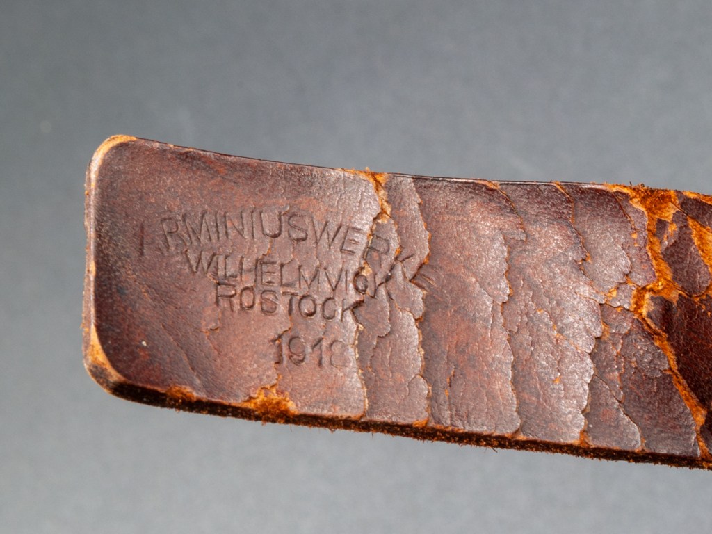 Originally the woostaub finished helmets were painted something like field grey but over time they tend to take on a brownish patina due to oxidization like this specimen. I presume this is because the wool in the paint absorbed moisture. The tab on the chinstrap is nicely named to the manufacturer, “ARMINIUSWERKE, WILHELMVICK, ROSTOCK, 1918.” The short end of the chinstrap is broken in two places and held together by a clip for display purposes. As with all original ECO helmets, it is marked “ET64.” The size is additionally indicated in black ink on the back of the interior section of the helmet skirt. In the same area there is an “AK” black ink stamp where the right leg of the “A” coincides with the back side of the “K.” This was the stamp for “Abnahmekommando” or “Acceptance Command” which was the military authority responsible for inspecting procurements.