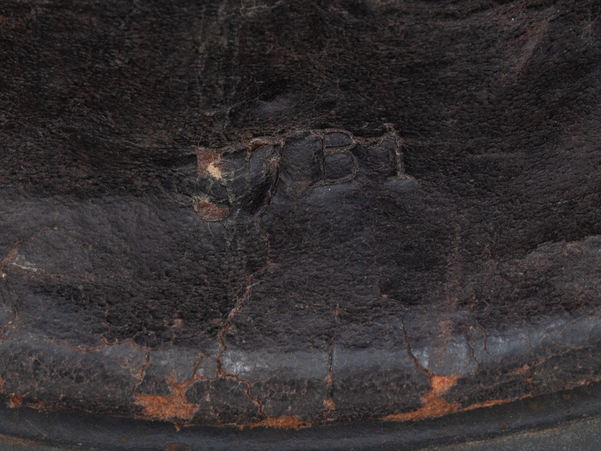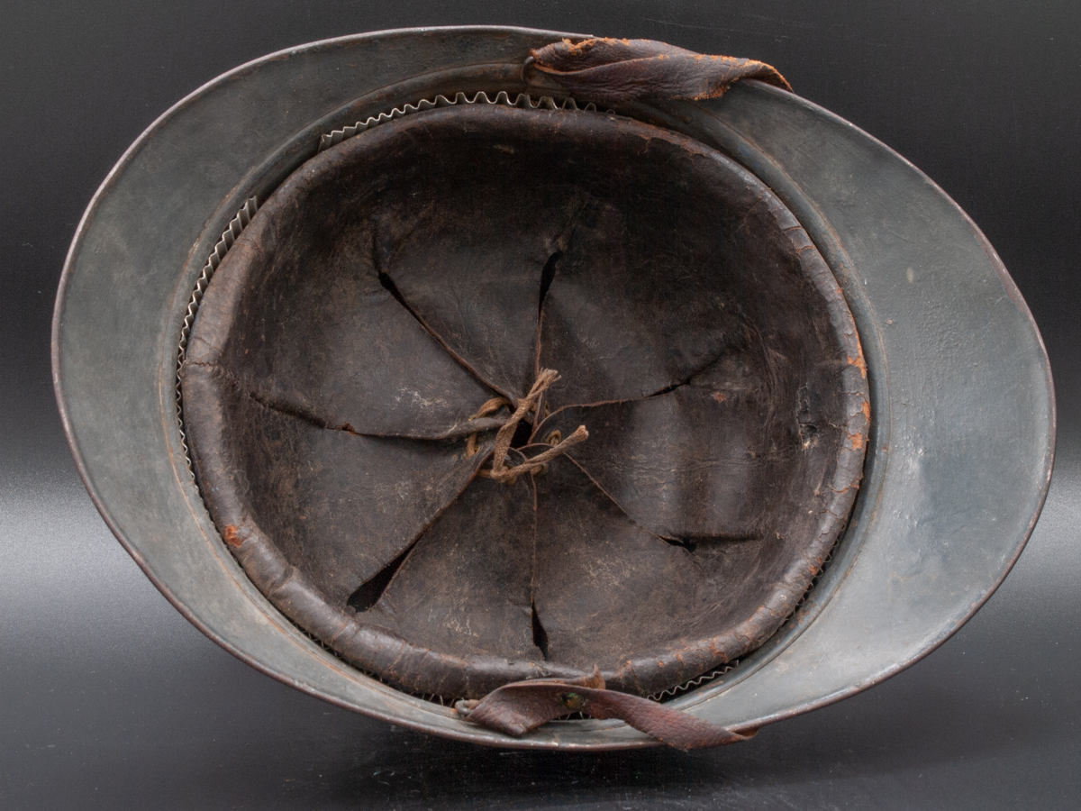 Displayed Example: The size markings on French M15s were often embossed on the leather liners. These markings frequently become faint or invisible over time, but this example is nicely stamped “57B1.” The “B” represents the shell size in the A-B-C sizing scheme used by the French in the First World War. The “1” corresponds to the smallest of three liner sizes that were installed in the size B, or medium sized shells. The head sizes for the B shells were 57, 58, and 59. A B1 marked liner would be for a size 57 head. The “57” stamp is therefore somewhat redundant. Likely, not everybody in the French armed forces were privy to the A-B-C, 1-2-3 sizing scheme, so having the numerical size would have been helpful.