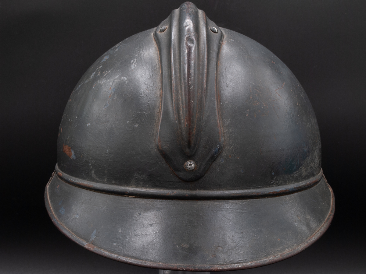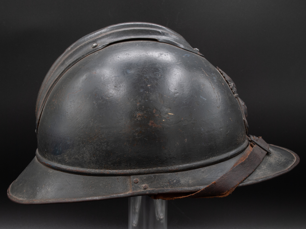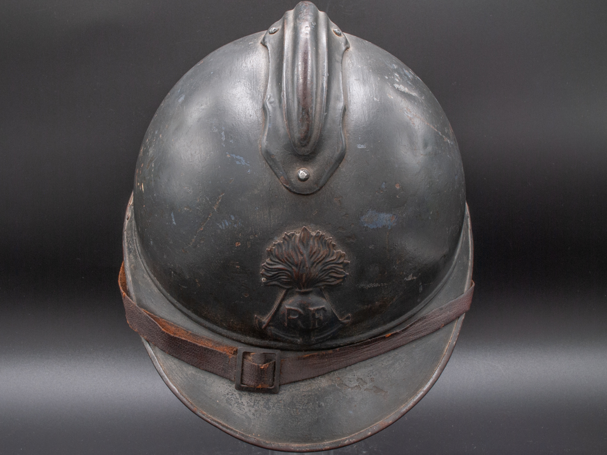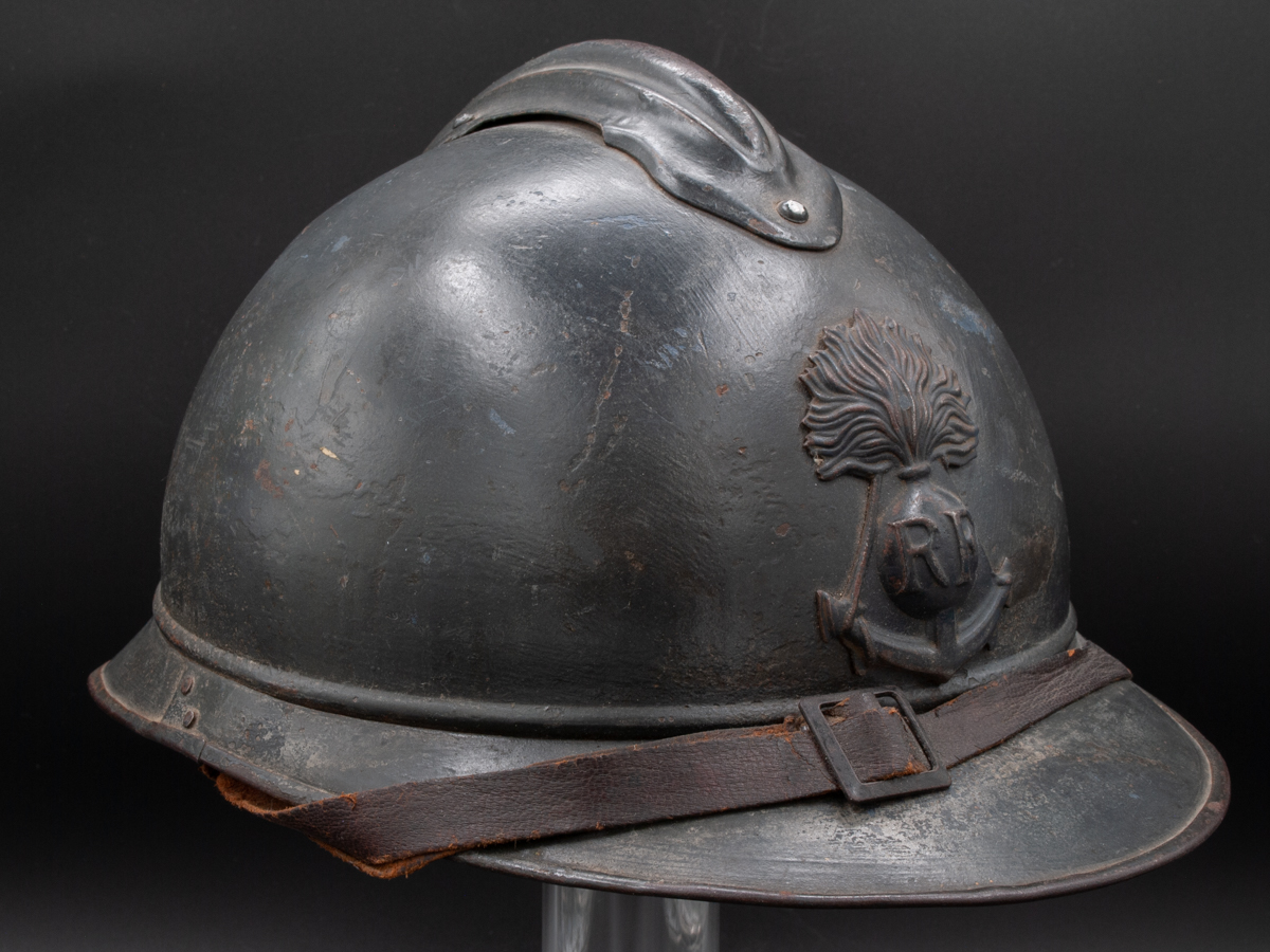 General Information: The French Model 1915 with a flaming bomb and anchor badge was issued to navy and French colonial troops. The helmets used by colonial troops were sometimes painted brown. French colonial troops from Islamic countries were issued helmets with a crescent moon and the letters “RF.” I presume the helmets with the anchor badges were reserved for troops from non-Islamic colonies, but I have not seen any documentation on this. In 1929, France introduced a new statutory badge for the M15 helmet, consisting of just an anchor, was for colonial and naval troops.