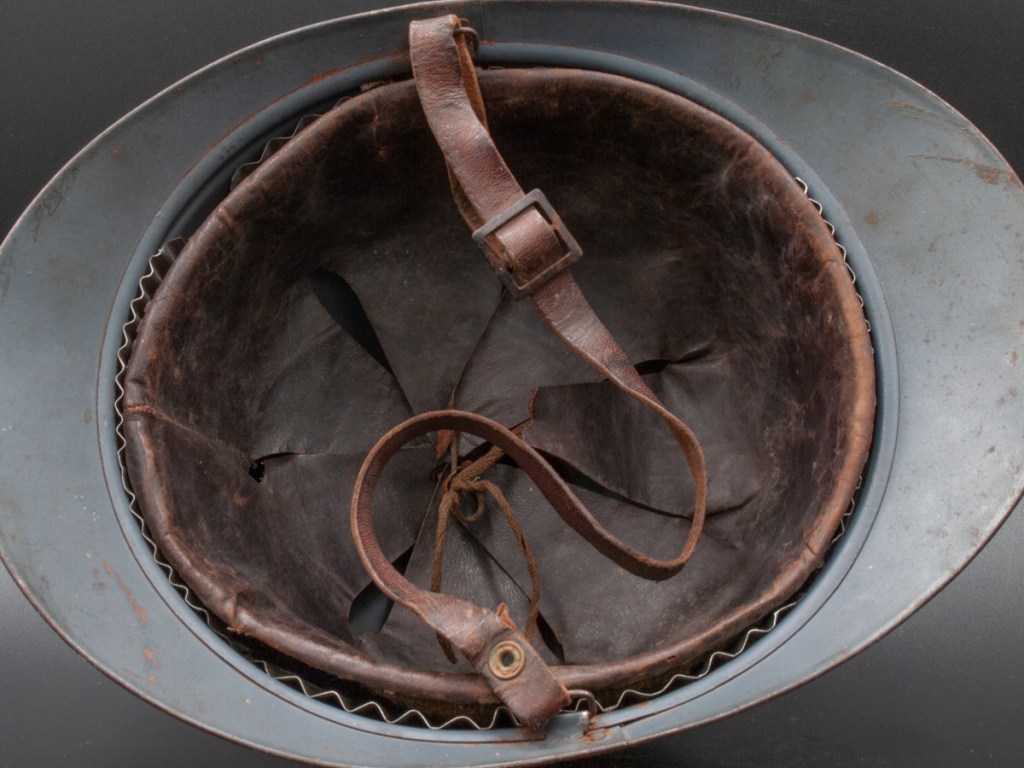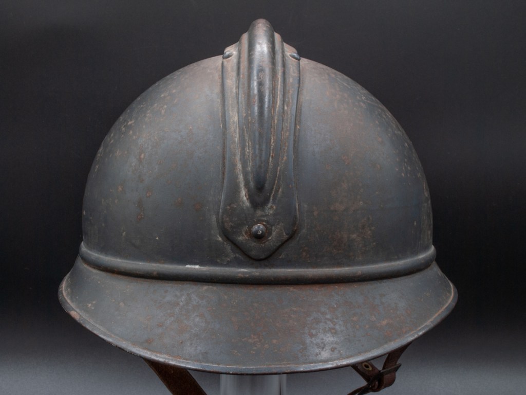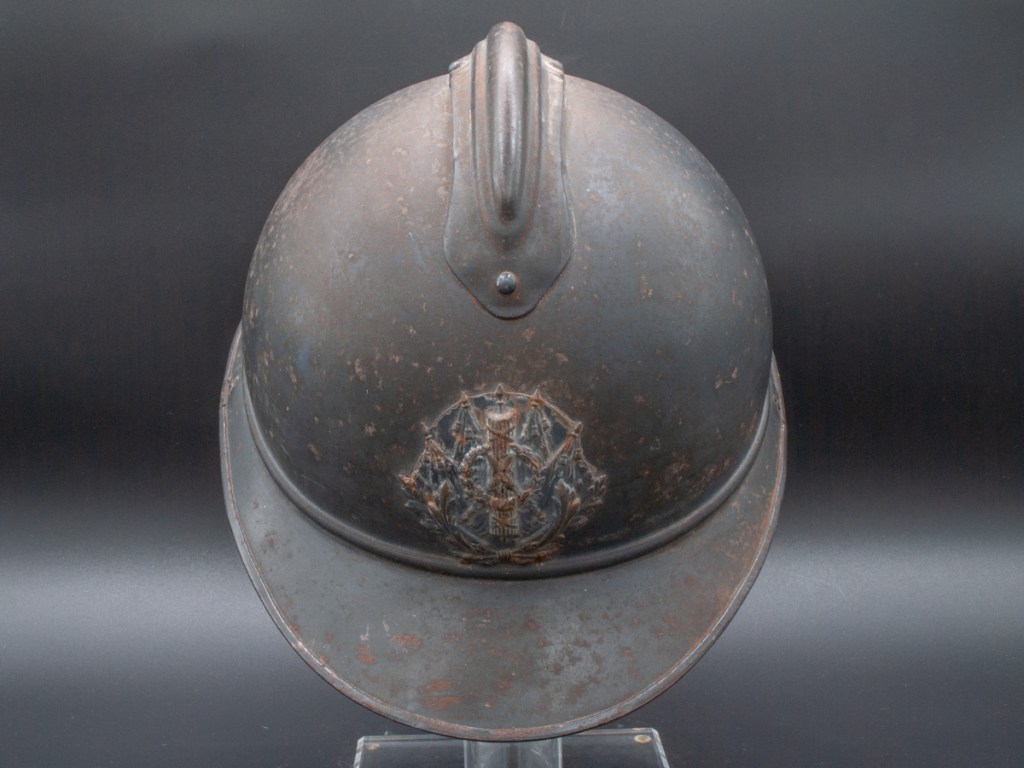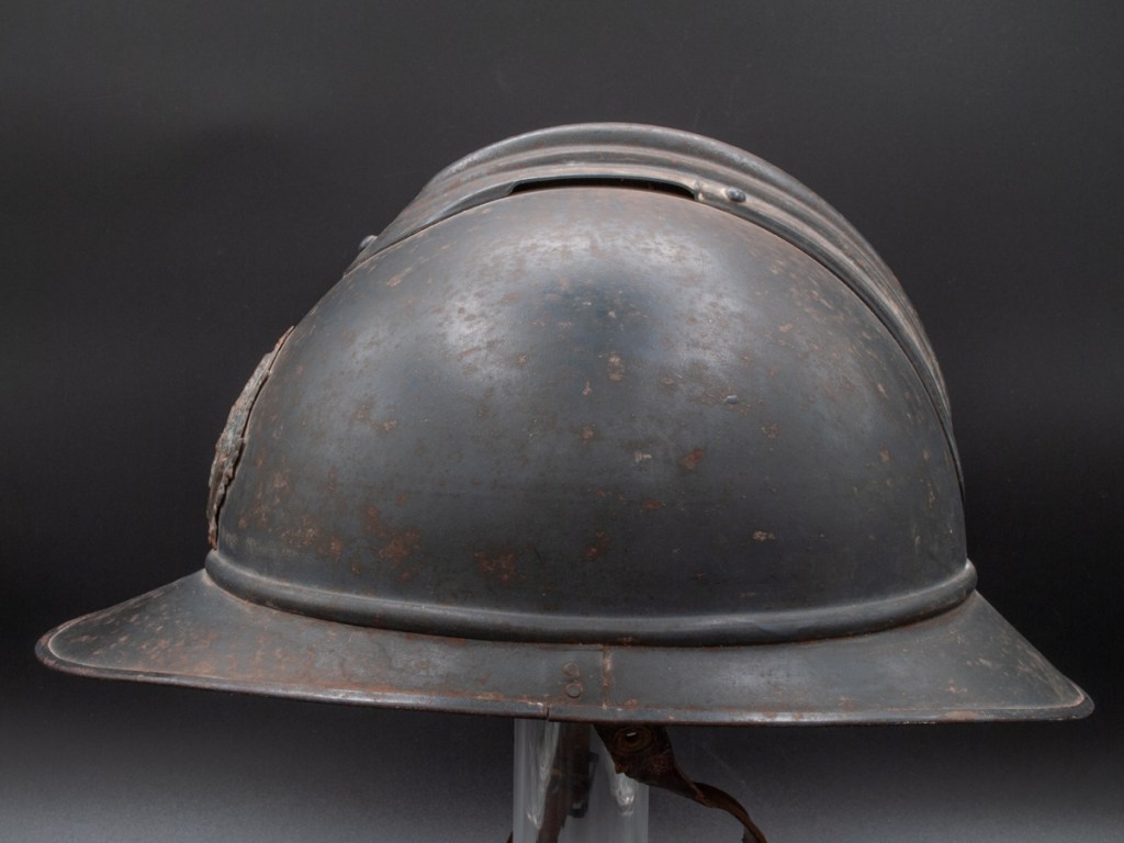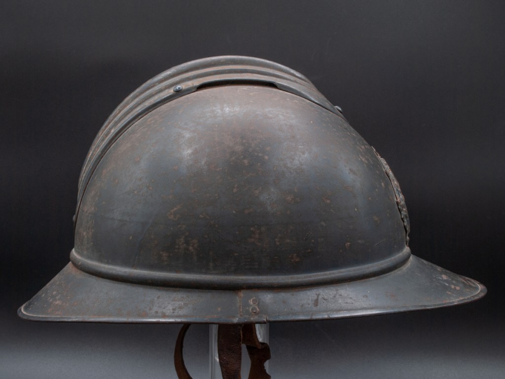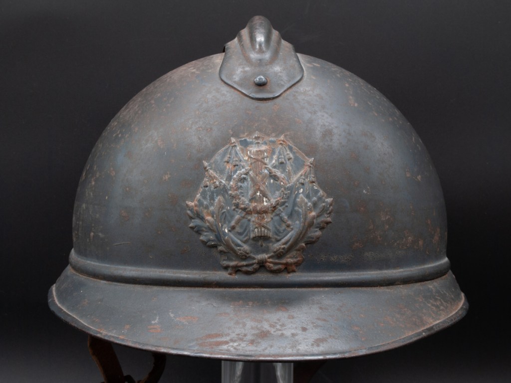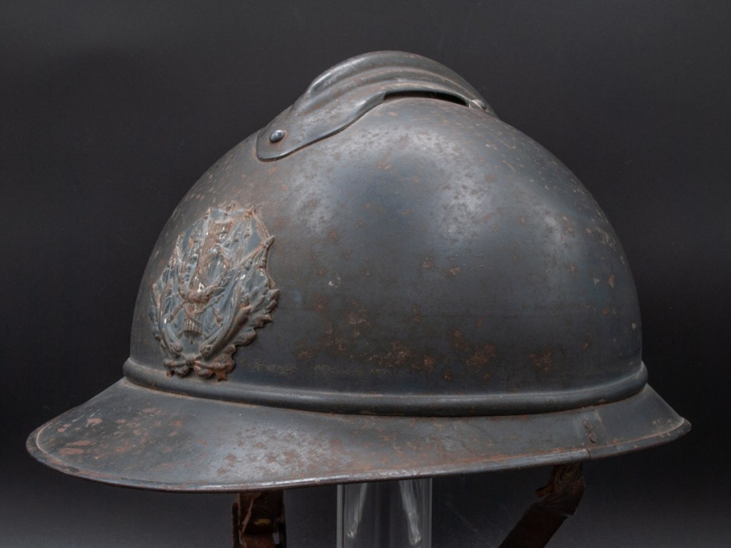 Collector Notes: Authentic French M15 intendance helmets are very hard to find. They are offered for sale rarely. There are fakes, naturally. The reproduction badges have voided space between the flag poles that radiate from the background. My friend who sold me this helmet, who is also my go-to authority on anything relating to Adrian helmets, told me that he had never seen an authentic intendance badge with the design used for the reproductions. Whether any of these are authentic, I could not say. My advice for collectors, however, would be to look for an example with a badge that looks like the one in this post. This is more of an overall round shape with no empty space between the flag poles.