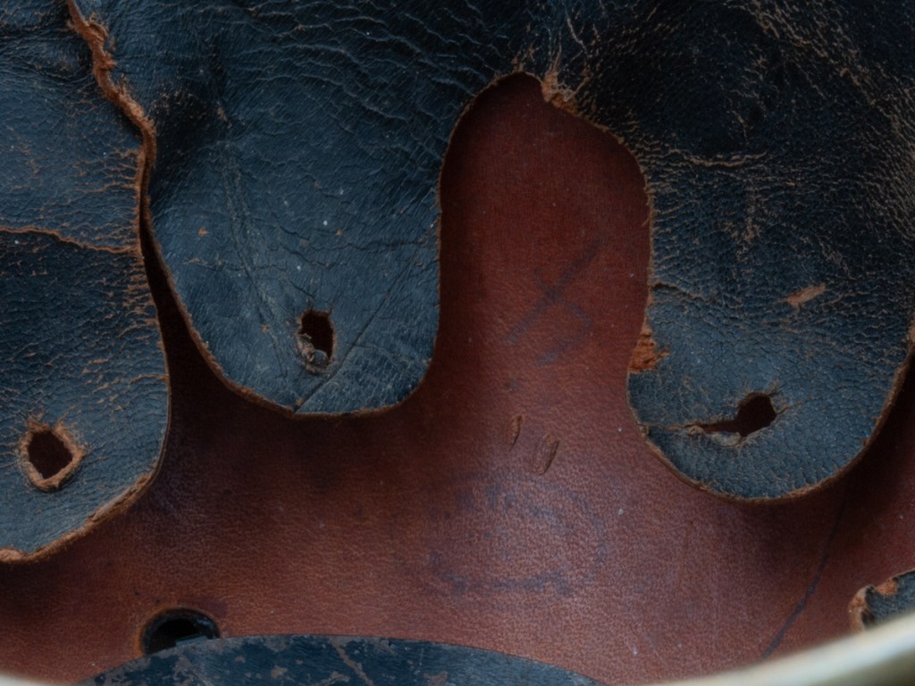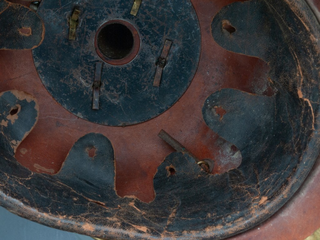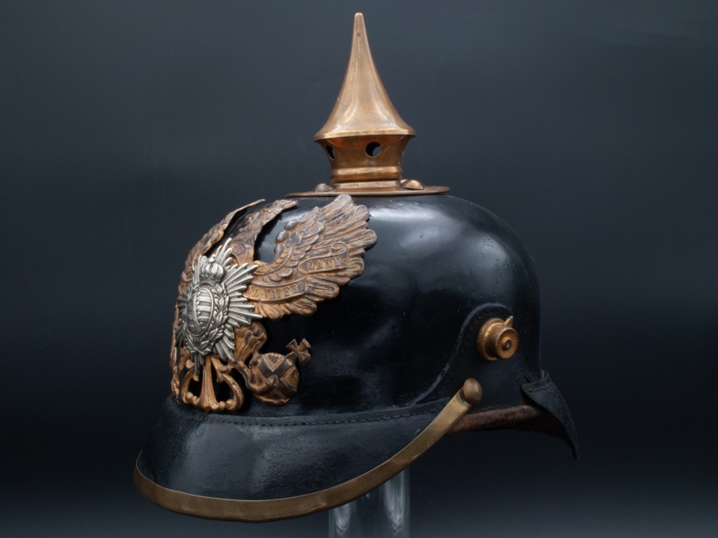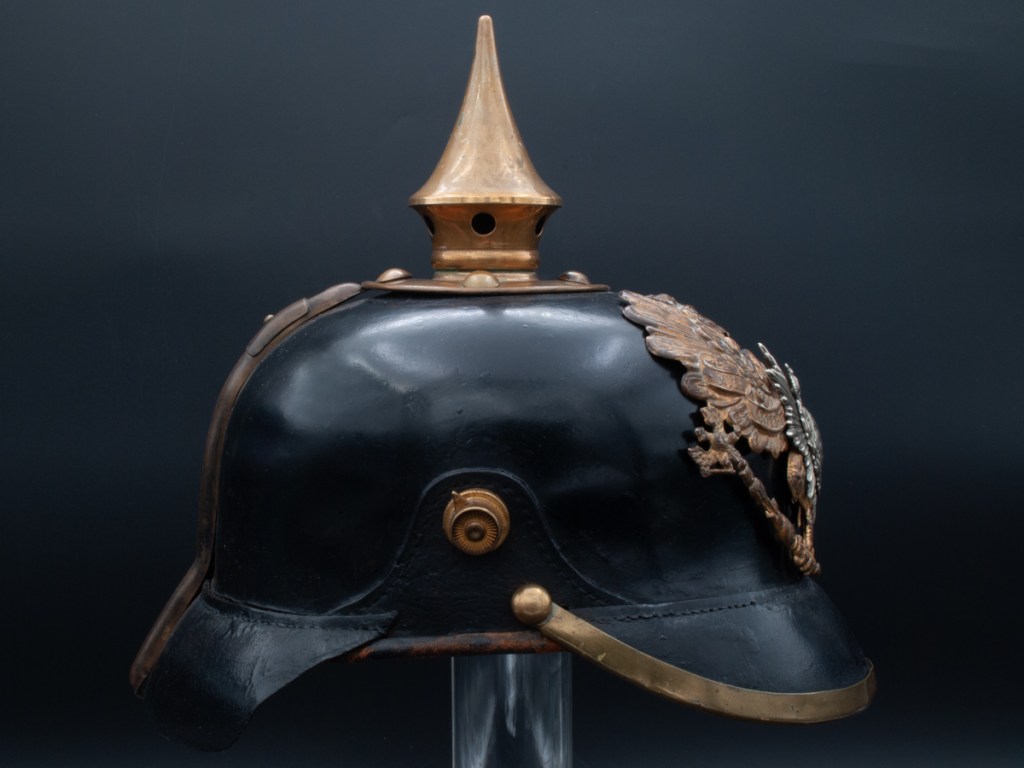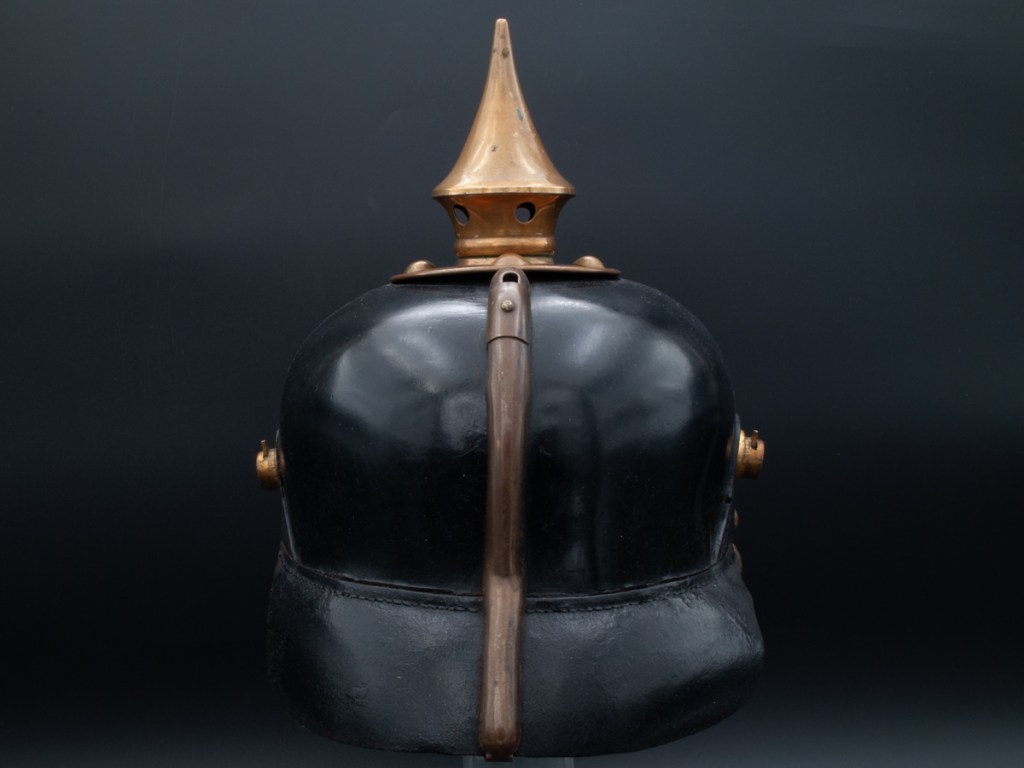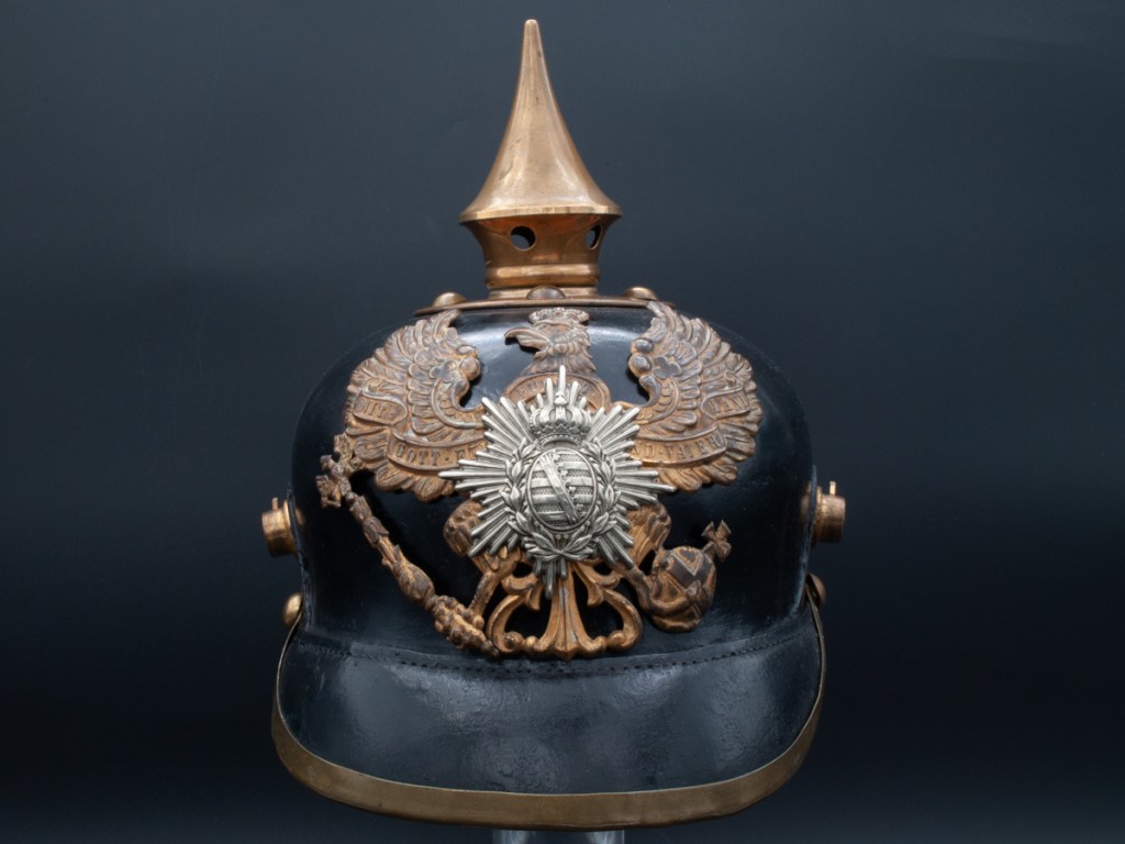Saxon Thuringian 153rd Infantry Regiment model 1895 enlisted man’s pickelhaube. The 153rd Regiment was from the Saxe-Altenburg duchy in Thuringia. Fine black leather helmet body with brass trim. Helmet body is in excellent form, lacquer with only minor flaws. Both visor with good stitching. The black leather tongue style liner is still supple and there are no pull-throughs on the drawstring holes. No extra holes in helmet body. Prewar quality brass trim. Enlisted style spike top that does not untwist. Original brass brads holding base to helmet body.