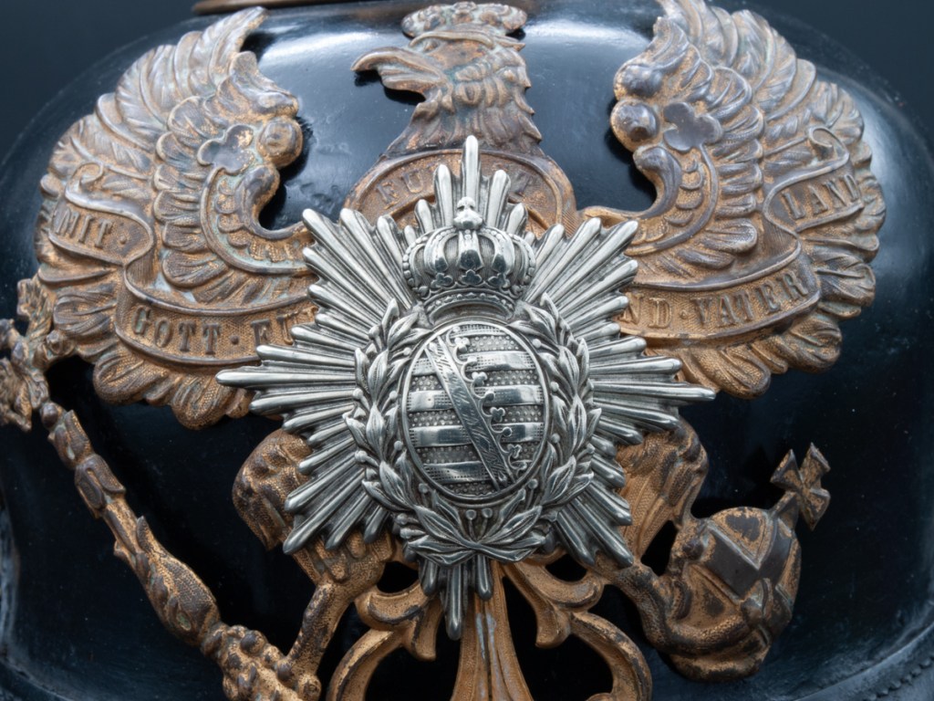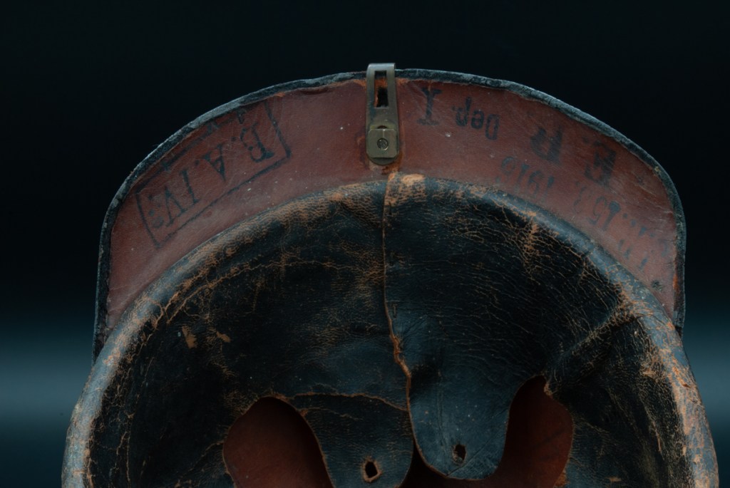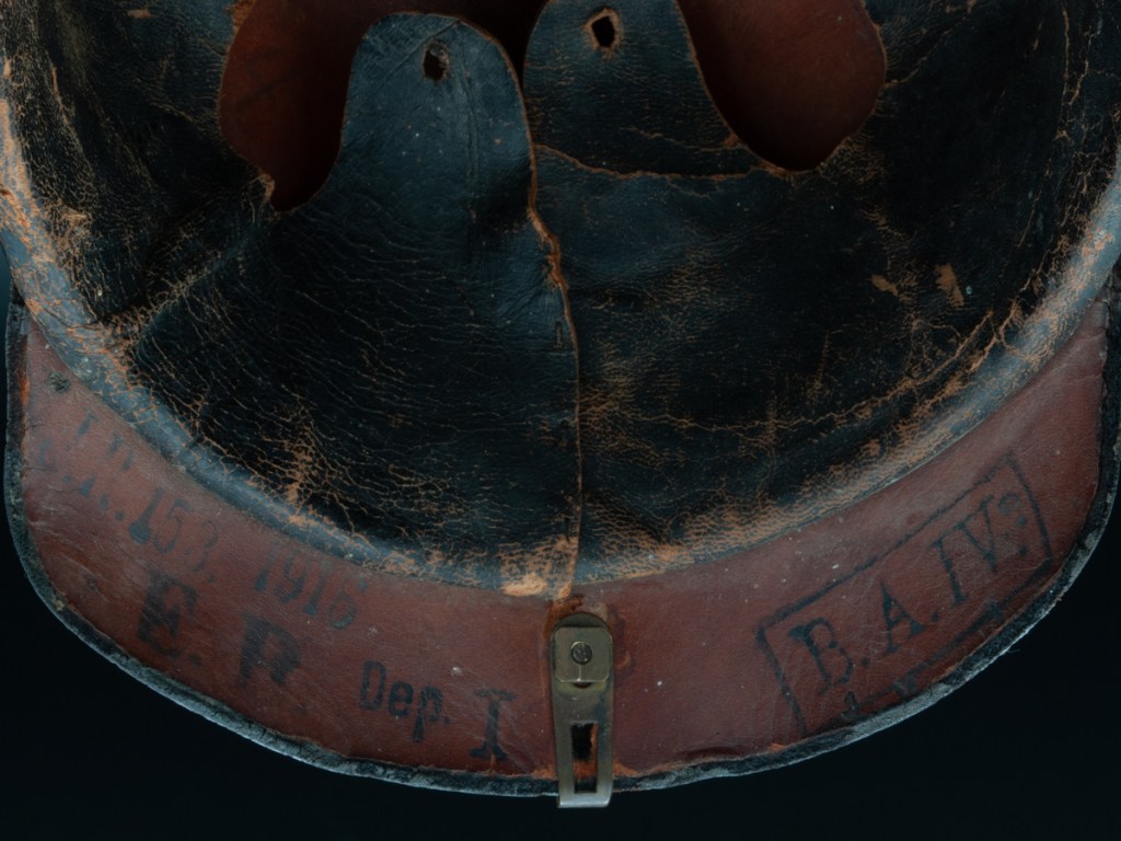 The frontplate is the Prussian style brass eagle but rather than “Mit Gott für König (king) und Vaterland” the banner reads “Mit Gott für Fuerst (prince or sovereign) und Vaterland” which is correct for a duchy like Saxe-Altenburg versus a kingdom like Prussia. Mounted on the eagle front plate is a silver star and Saxon crest surround on both sides by laurel leaves. The frontplate is secured to helmet body by leather pieces which appear original. The rear visor is nicely marked “I.R. 153” and “E.R.” which stands for “Ersatz Regiment.” The ersatz regiments were initially meant to train and supply replacements for active regiments although many were upgraded from training units to active service during the war. The “B.A. IV” stamp on stands for Bekleidungsamt IV, indicating the helmet was inspected and issued by the 4th Clothing Depot (Clothing Depot/Army Corps District IV). This is the correct army corps district for I.R. 153. This helmet is in excellent condition. It is clearly dated “1916” and this correct as the Germans continued to use brass trim on pickelhaubes until they used up existing stocks. It is a beautiful example of a rare regimental helmet.