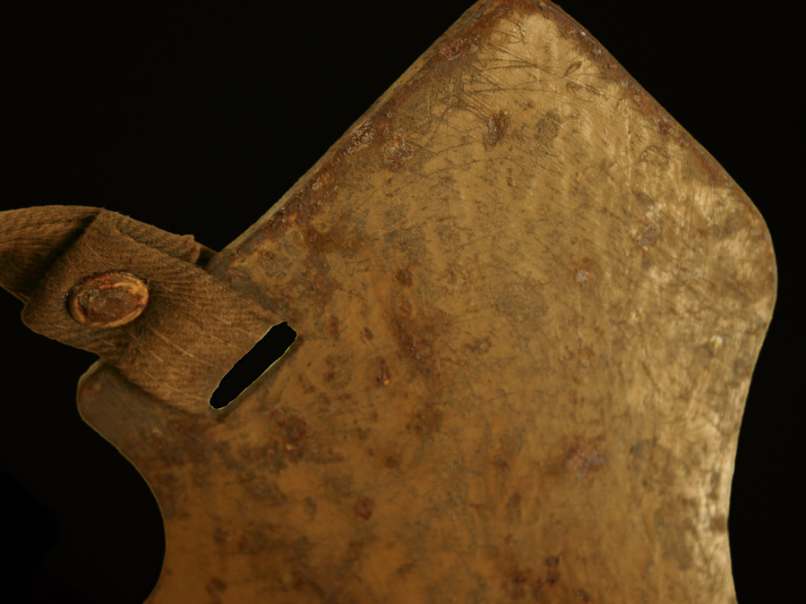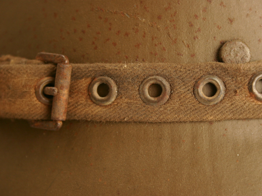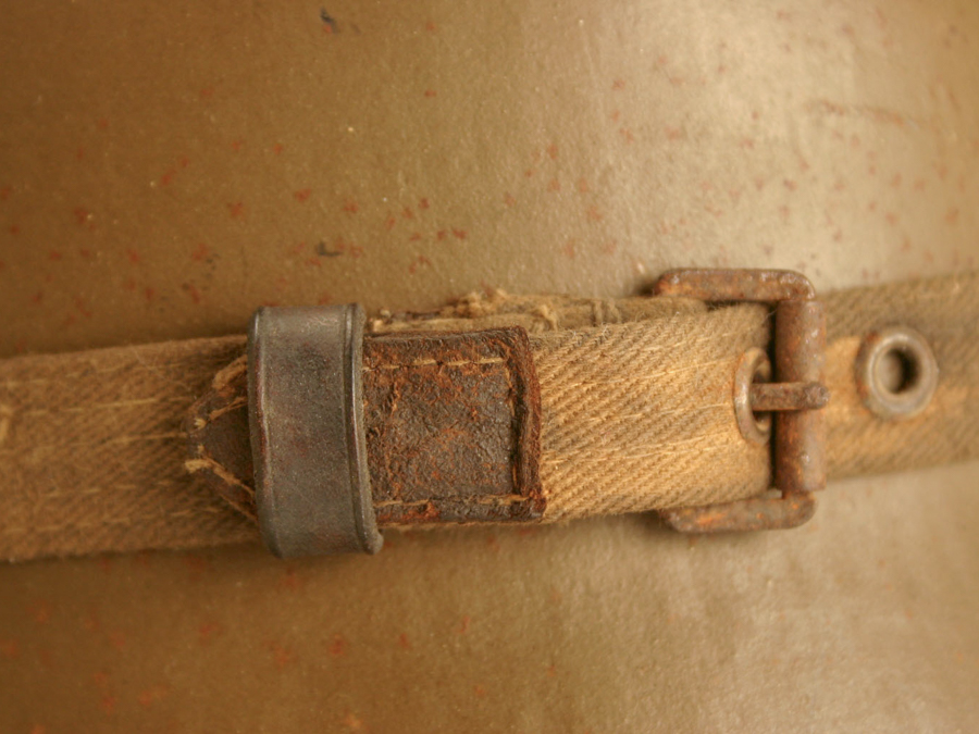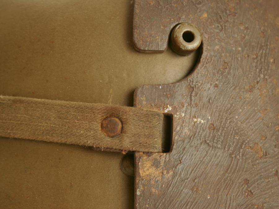 When the manufacturer’s ink stamps are worn off, which is normally the case, there are features that are distinctive for some of the Stirnpanzer makers. The Phönix company used a unique yellowish field brown type paint. The Böhler company used rivets rather than stitches to attach their straps. Weiss attached pieces of leather trim to the back of the straps at the ends to protect the textiles from wear at the point of attachment to the metal shield. The Böhler Stirnpanzers were thicker and heavier than the Phönix and Weiss Stirnpanzers.[4][5]Information about Stirnpanzers made by Poldihütte was lacking at the time of writing this post.