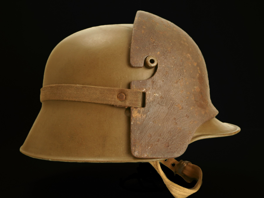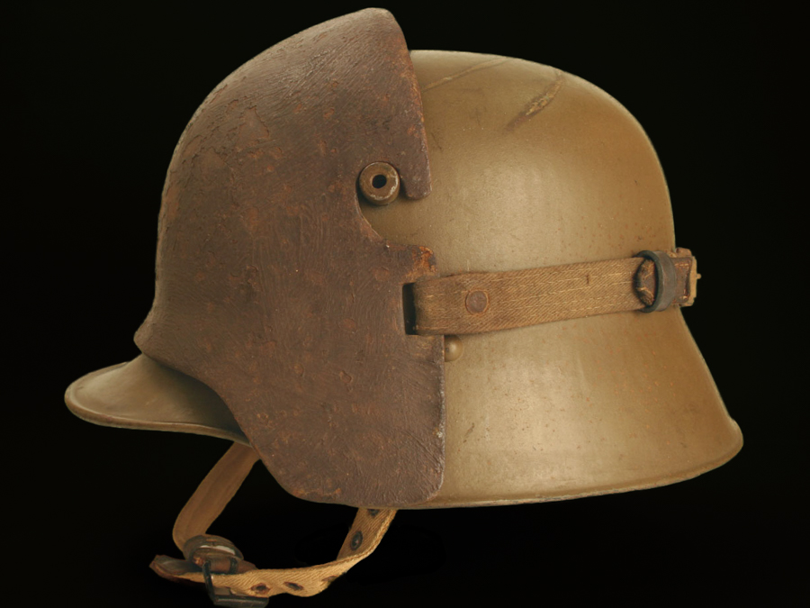 Collector Notes: Approximately 5% of the Austro-Hungarian helmets were to be equipped with Stirnpanzers. The chronic shortage of nickel, an essential ingredient for both Stirnpanzers and helmets, however, resulted in the need to return to foundries already manufactured Stirnpanzers to make helmets.[6] The production target for German Stirnpanzers was the same: 5%. Because many more German helmets were made in the First World War than Austro-Hungarian helmets, the actual number of Stirnpanzers to be made by Austro-Hungary was significantly smaller than it was for Germany. That together with the fact that many of the Austro-Hungarian Stirnpanzers were melted down means that surviving examples Austro-Hungarian models are scarcer than their German equivalents.
